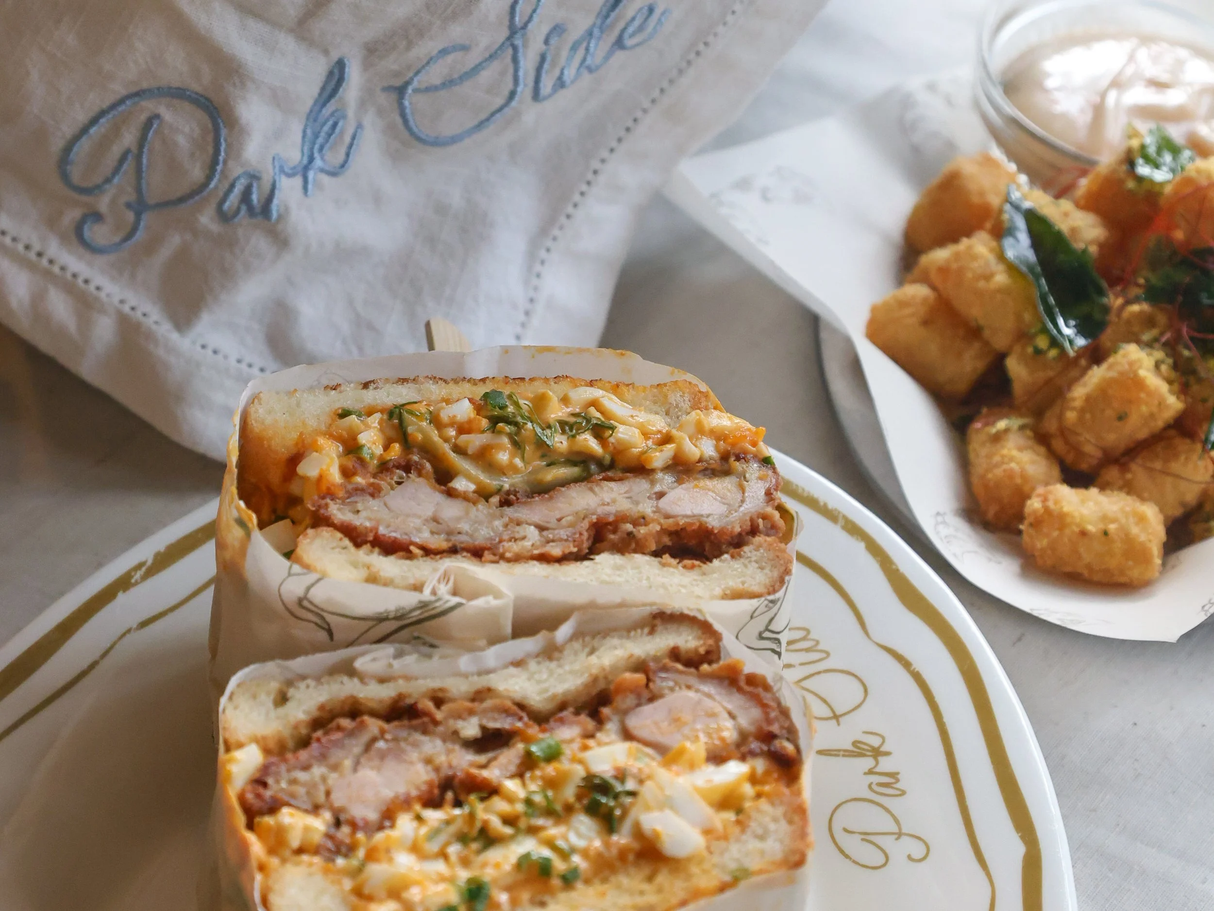 Sambal egg mayo, fried chicken, soft milk bread.